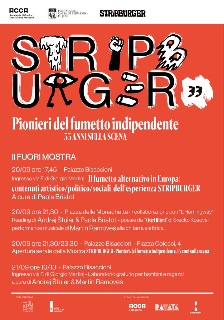 – 4 ottobre | ore 21,30 > Presentazione del film animato “STRIPBURGER IN MOTION”, regia di Boris Dolenc. L’appuntamento in piazza delle Monachette in collaborazione con “L’Hemingway”, a pochi metri dalla sede della mostra, oltre alla proiezione del corto proporrà un incontro con il co-curatore della mostra e docente di storia del fumetto, Alessio Trabacchini, condotto da Roberto Gigli. Il talk approfondirà i contenuti del film e, più in generale, le radici artistiche creative e sociali dell’esperienza più che trentennale di Stripburger.